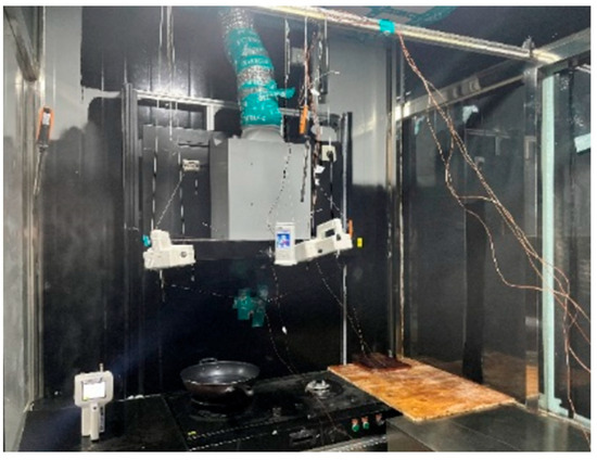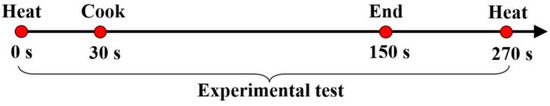 Figure 1 presents a schematic of the measurement points in the experiment. The equipment and devices used are shown in Figure 2, while Figure 3 provides a photograph of the test kitchen. To more accurately replicate real cooking conditions, the test involved frying potatoes in three distinct stages: pot heating for 30 s, frying for 120 s, and cooling for 120 s, as illustrated in Figure 4. The range hood remained operational throughout the experiment to maintain realistic ventilation conditions.