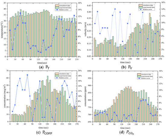 Figure 6 presents a comparison of the simulated and experimental results for temperature, velocity, COFP, and CO2 after applying a 10-s time-averaging process to both datasets. The experimental values closely follow the measured trends, indicating that the simulation model accurately captures airflow perturbations during the cooking process. Overall, deviations remained within 10% for most points at the same locations and time intervals. Despite minor discrepancies, the simulation effectively reproduces the variation patterns of COFP and CO2 in the kitchen environment, demonstrating its high accuracy and reliability in replicating real-world conditions.