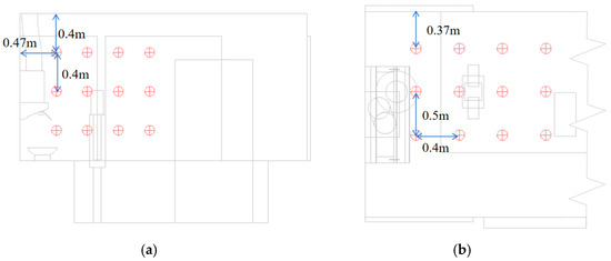Several indicators were analyzed in the tested kitchen cooking space to evaluate the impact of airflow temperature and velocity on overall thermal comfort. To quantitatively assess the comfort indicator (ADPI), 36 measurement points were strategically positioned near the subject’s body within the monitoring area. Using ANSYS Fluent 2021R1, temperature and air velocity values were computed at each location, and the ADPI was subsequently calculated through Equations (5) and (6). The locations of the monitoring points are shown in Figure 7. Additionally, this study developed an implementation of the PMV (predicted mean vote) equation in the C programming language. Through the User Defined Functions (UDF) interface in ANSYS Fluent, the custom C program was executed to compute PMV values near the human forehead and mouth. The averaged value of these measurements was derived as the PMV indicator.