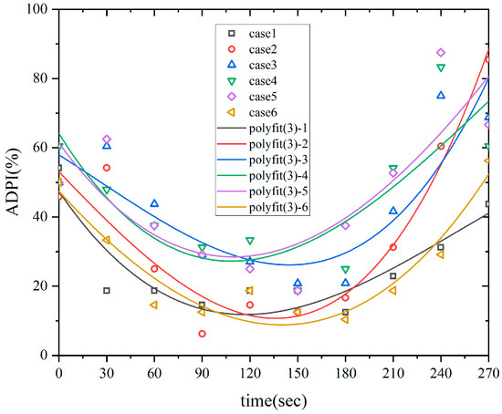 Figure 9 shows the ADPI values and corresponding fitting curves derived from the analysis of six different operating conditions. The results indicate that the lowest ADPI value for condition 5 was 28.48%, which was 16.64% higher than the original condition’s lowest value of 11.84%, which effectively improved the airflow pattern. Additionally, with the top air supply system remaining active, the ADPI began to increase after 150 s. The optimal performance was observed in condition 5, where the ADPI reached approximately 80% after 270 s. This demonstrates that utilizing an effective top air supply could expedite the removal of hot, polluted air.