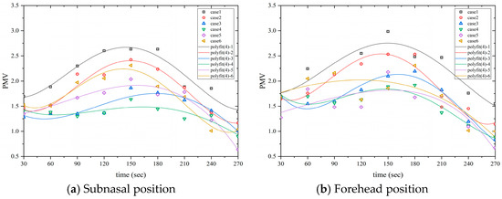 Fitted plot of PMV over time for different conditions.