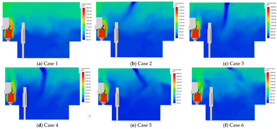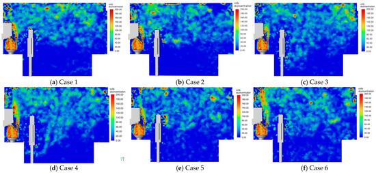 Figure 13 shows the spatial distribution of COFP at the time of 150 s under different conditions. The results indicate that COFP ascended to the upper part of the room with the thermal plume generated during cooking and formed a distribution pattern similar to an “air lake”. Vertically, the COFP spatial distribution shows higher concentrations near the top and lower concentrations further down. At 150 s, the top air supply influenced the diffusion behavior of COFP. In condition 2, due to the smaller air supply angle, COFP primarily accumulated near the occupants’ faces, adversely affecting air quality in the breathing area. In conditions 2 to 5, the angles of the air supply were less than 45 degrees relative to the vertical direction, causing some COFP to descend below occupants’ waists. In condition 6, with a supply angle of 150 degrees, although the vertical transport of airflow was not pronounced, it still drove the transport of COFP “attached” to the air flow moved clockwise, reduced the COFP concentration near the occupants and improved overall air quality.