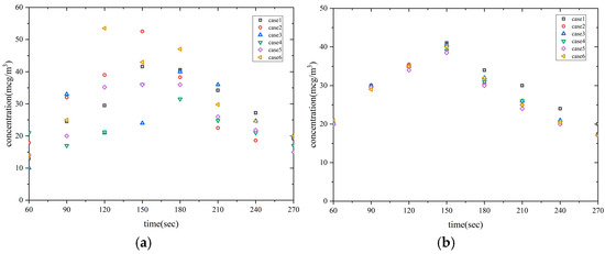 COFP concentration is one of the key indicators for assessing air quality during cooking. Figure 14 presents a time-domain scatter plot of the average COFP concentration in the breathing area and the average concentration throughout the room under different conditions. As shown in the figure, the average COFP concentration in the breathing area is mostly below 50 µg/m3, which is considered within a healthy range. However, due to the complex behaviors of COFP, such as coagulation, transportation, and deposition, the data in the breathing area exhibited significant fluctuations. The trend in the average concentration throughout the room remained relatively consistent, with no significant changes, indicating that the top air supply method had a limited effect on the removal of COFP.
