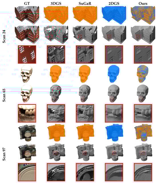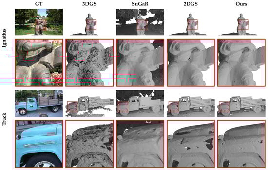 Two-Dimensional Gaussian Splatting (2DGS) [] replaces ellipsoid-shaped 3D Gaussians with oriented, elliptical disk-shaped 2D Gaussians, enhancing geometric detail in surface reconstruction. In addition, 2DGS replaces the covariance matrix with a homogeneous transformation matrix, allowing precise 2D-to-2D mapping. Depth maps are estimated to facilitate mesh extraction through truncated signed distance fusion (TSDF) using Open3D []. This depth information functions as a regularization term, encouraging the concentration of 2D Gaussians and aligning rendered normal vectors to achieve smoother surface reconstruction. However, these regularization constraints often lead to overly smooth surface reconstruction [], further exacerbated by the limited capacity of 2D Gaussians to capture volumetric details.