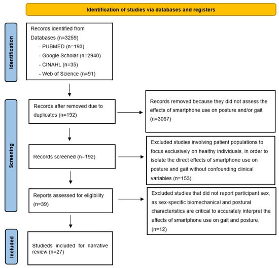 Individual studies examining the effects of smartphone use on spinal posture and gait were identified through a comprehensive narrative review. PubMed, Web of Science, Google Scholar, and CINAHL databases were systematically searched for studies published in SCIE journals listed in Journal Citation Reports between January 2009 and June 2024. The search strategy employed was as follows: “smartphone OR cellphone AND gait OR walking AND posture OR postural alignment [Title/Abstract]” across PubMed, Google Scholar, Web of science and CINAHL databases. A total of 3259 articles were initially retrieved; among these, 3067 articles unrelated to spinal posture and gait were excluded. Of the remaining 192 studies, 153 studies that did not include healthy participants were excluded, along with an additional 12 studies lacking gender specification. This process resulted in the final inclusion of 27 studies in this review.