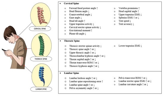 Seven studies have investigated the effects of smartphone use on cervical spine posture [5,11,12,13,14,15,16,17]. Prolonged smartphone use has been shown to significantly increase cervical flexion angles, thereby elevating the risk of posture-related cervical issues [15,17]. For example, using a smartphone while seated without backrest support increased cervical head flexion by approximately 2° [5]. Similarly, individuals who used smartphones for more than 4 h per day exhibited forward head posture angles that were, on average, 9° greater than those who used them for less than 4 h [14]. Collectively, these findings indicate that smartphone use shifts the head position anteriorly, increases cervical flexion, raises muscular loading around the cervical spine, and slows cervical nerve conduction velocity [14]. Additional studies have shown that smartphone usage exceeding 3 h daily contributes to greater cervical flexion angles, increasing biomechanical load and elevating the risk of cervical intervertebral disk herniation and degeneration [44,45].