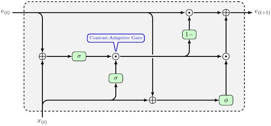- The input undergoes processing through a linear layer. The resulting output determines the next hidden state, which is passed to the content-adaptive gate. If the previous hidden state is unavailable, the output directly becomes .