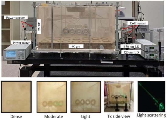 The experimental system consists of a rectangular dust chamber with dimensions of 90 cm × 40 cm × 40 cm, as shown in Figure 1, designed to emulate dusty atmospheric conditions in a repeatable manner. The dust sample used in this study was collected from a real dust storm event. The particle size distribution was analyzed using a particle size analyzer (SALD 2300, Shimadzu Corporation, Kyoto, Japan), which indicated a Lognormal distribution with a mean diameter of 17.3 µm and a standard deviation of 11.7 µm. Fans were installed to blow up the dust after injection, and uncoated precision windows (with a loss of ∼4% per surface) were used to transmit optical signals. Two single-mode fiber-coupled laser diodes (LDs) were used: a 1550 nm LD (Keysight, Santa Rosa, CA, USA, N7714A) with 4 mW output power for the primary FSO link and a 520 nm Fabry–Pérot LD (Thorlabs, Newton, NJ, USA) for visibility measurements. Each beam was collimated using aspheric lens collimators, and the received optical power was detected using Thorlabs photodiodes (PDs) (S122C for the 1550 nm LD and S120C for the 520 nm LD) with −43 dBm sensitivity connected to a Thorlabs PM320E power meter. The S120C and S122C PD power sensors offer a typical measurement accuracy of and resolutions of 1 nW and 2 nW, respectively. These specifications, combined with built-in shielding and a large sensor aperture, support high precision and stability in detecting low-power optical signals such as those used in our experiments.