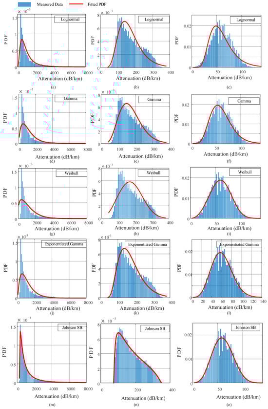 Measured histograms with fitted PDFs for various distributions across three dust conditions: dense (left), moderate (center), and light (right). The Johnson SB distribution shows superior visual alignment with empirical data in all regimes. Subfigures represent the following distributions: Lognormal (a)–(c), Gamma (d)–(f), Weibull (g)–(i), Exponential Gamma (j)–(l), and Johnson SB (m)–(o).