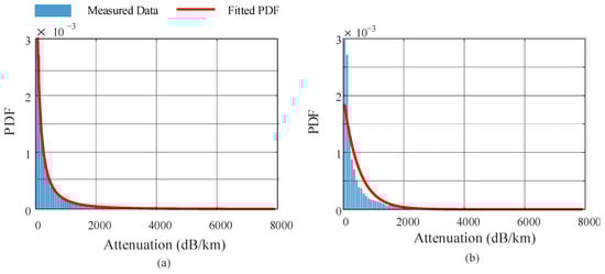 The experiments were conducted in a dark room to eliminate ambient light noise. This process was repeated eight times under identical conditions to ensure consistency across measurements and to collect sufficient data for robust probabilistic model fitting. To assess repeatability, we evaluated the attenuation statistics within a fixed visibility bin centered at 500 m (±25 m) across all eight sessions. The specific attenuation values showed consistent behavior across sessions, with mean values ranging from 138.2 to 149.8 dB/km and standard deviations between 14.1 and 16.0 dB/km. These results demonstrate that the measurements remained stable and reproducible under equivalent dust conditions.