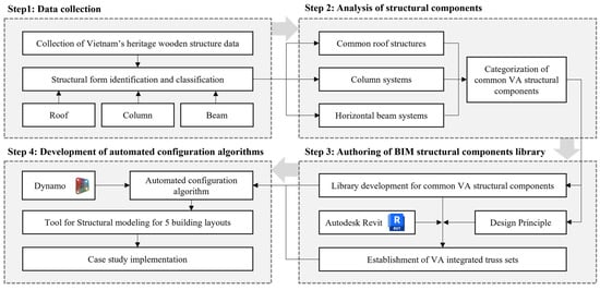 The objective of generating preliminary design concepts for vernacular-inspired structures using BIM necessitates a systematic and rigorous research process to ensure effective data collection, analysis, and modeling. The proposed methodology, illustrated in Figure 1, comprises four sequential steps: (1) data collection, (2) analysis of structural components, (3) authoring of a BIM structural components library, and (4) development of automated configuration algorithms. This process begins with collecting VVA data, focusing on distinctive roof forms (Top Roof, Side Roof, Veranda Roof) and their dimensions to establish a foundation for analysis. The second step involves a detailed examination of vernacular structural components to define their characteristics for accurate BIM representation. The third step utilizes Autodesk Revit to construct 3D models of these components, adhering to BIM protocols to ensure precision and forming a structural framework for multi-bay configurations. Finally, an automated modeling system is developed using Dynamo within Revit, where scripts automate repetitive tasks, such as generating roofs, columns, and beams, enhancing efficiency, minimizing errors, and enabling parameter-based adjustments. The resulting 3D model supports data export as spreadsheets, facilitating subsequent design stages and fostering innovative design ideation grounded in VVA principles.