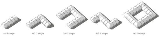 Regarding the organizational form of the building floor plans, the study identified five common floor shapes, as shown in Figure 2, with typical bay dimensions ranging from 2.2 m (e.g., Temple of King Dinh Tien Hoang, Truong Yen Commune, Hoa Lu City, Ninh Binh Province) to 6.4 m (e.g., Phat Diem Cathedral, Phat Diem Town, Kim Son District, Ninh Binh Province). These variations highlight the diversity of spatial configurations in VVA structures, which, combined with the structural analysis of roofs and columns, supports the development of conceptual designs that reflect traditional Vietnamese architecture’s technical and cultural dimensions.