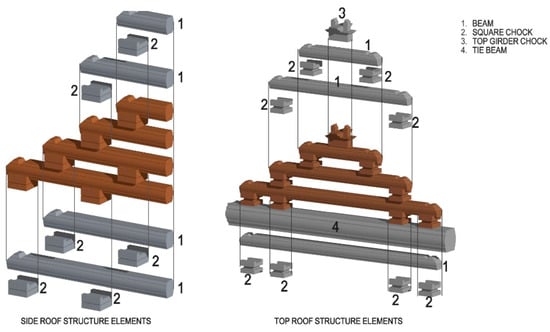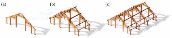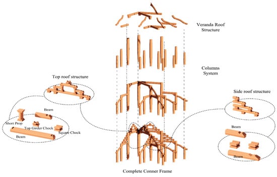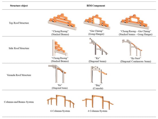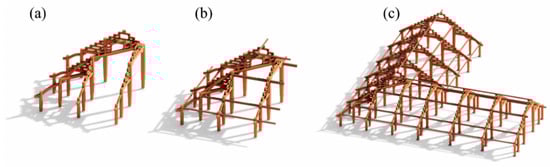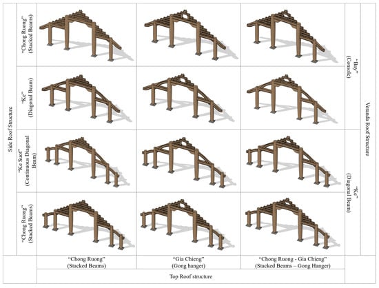 Statistical data in Table 3 highlight the diversity of Roof structure forms, including 17 configurations for Top Roof structure, 16 for Side Roof structure, and 9 for Veranda Roof structure. Combining these forms results in a wide array of roof structure variants. This study concentrates on the most frequently occurring and structurally representative configurations. For Top Roof structure, the predominant forms include Stacked beam, Gong-hanger, and a hybrid of Gong-hanger–Stacked beam. The Side Roof structure primarily features Stacked Beam, Diagonal Beam, and Diagonal Continuous Beam forms, while the Veranda Roof structure commonly adopts Console and Diagonal Beam configurations. These selected typologies adhere to the “Upper Four, Lower Five” principle, ensuring both structural stability and cultural coherence [].