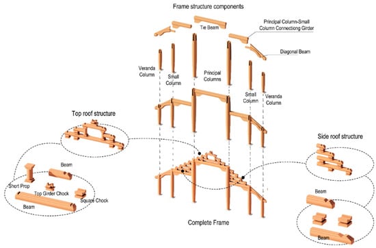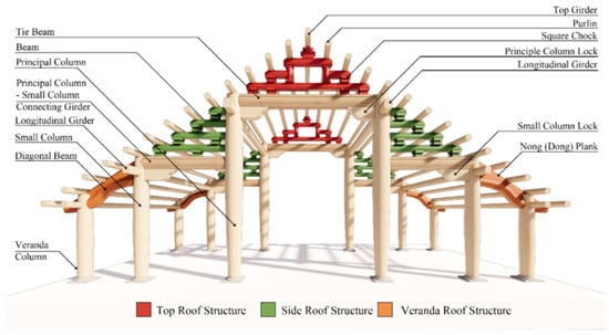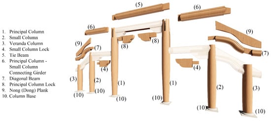 The roof-supporting framework, comprising columns and horizontal beams, is interconnected to form a robust structural system, with each component analyzed in detail in Figure 4. Each detail plays a crucial role in ensuring the durability and stability of the structure. Specifically, Column Base provides a solid foundation, distributing the load from the column to the ground, thus preventing the structure from sinking or tilting. The principal column is the central pillar, bearing the entire load from the roof and transmitting it downward to the base column, which plays a central role in the structural integrity. Small Column and Veranda Column aid in load distribution while extending the veranda space, enhancing the structure’s aesthetics and utility. Tie Beam connects the columns, forming a sturdy frame that helps maintain stability against impacts like storms. Principal Column–Small Column Connecting Girder strengthens the connection between columns, ensuring even load distribution. Diagonal Beam reinforces the frame’s rigidity, resisting lateral forces, and Principal Column Lock secures the joints, providing the robustness and longevity of the entire system. Nong (Dong) Plank is a bracing or connecting plank, and Column Base is the part itself or the footing.