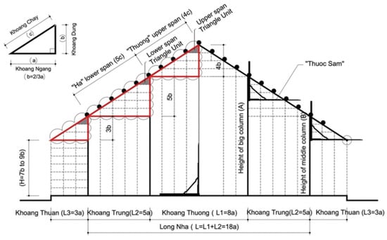 The regional diversity of VVA was elucidated by Le and Cao [], who investigated traditional design methodologies of indigenous architecture, revealing pronounced regional diversity across the Northern, Central, and Southern regions, reflective of adaptations to varying geographic, climatic, and cultural influences (Table 1). These distinctions arise from unique cultural, historical, and technical contexts. In the North, the “vi” (truss set) structure, based on triangular proportions and the “thuoc Sam” (Sam ruler), exhibits significant influence from ancient Chinese architecture, particularly that of the Song Dynasty, prioritizing intricate timber frameworks and standardized measurements. In contrast, Central Vietnam’s “nha ruong” (vernacular house) system utilizes four primary components—columns, rafters, beams, and struts—using the equilateral triangular “thuoc Nach” (Nach ruler) and a beam–column framework, reflecting adaptations from Cham techniques suited to tropical climates. Meanwhile, the southern Chams’ simpler three-column “nha ruong”, designed around human body proportions and the “thuoc Nac” (Nac ruler), reflects a minimalist and pragmatic ethos, untouched by Chinese influences. These regional variations highlight technical origins and encapsulate centuries of environmental and cultural adaptation.