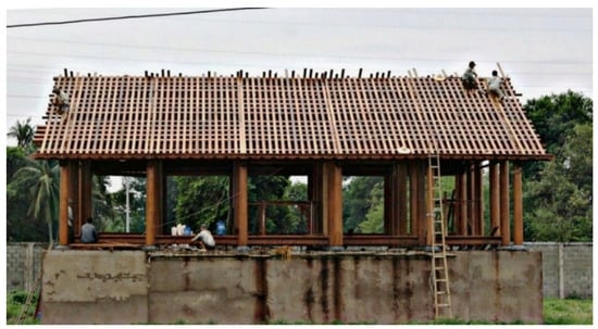 Once designed and manufactured, these components are meticulously assembled to form a cohesive structural framework, ensuring precision and consistency. In actual construction, these frames are securely interconnected by horizontal beams, creating a robust system capable of efficiently distributing loads. The spacing between frames, known as “gian”, is determined by the overall design and functional requirements. This term holds cultural significance in VVA, reflecting a rational spatial division tailored to the structure’s intended purpose. Figure 7 illustrates a vernacular structure in Ho Chi Minh City, Vietnam [], with five “gian”, clarifying the concept. In this context, a “gian” denotes the interval between adjacent columns within the framework, forming an organized spatial unit. The choice of an odd number of “gian” (e.g., 3, 5, or 7) reflects cultural beliefs in luck and prosperity, aligning with traditional feng shui principles.