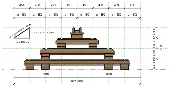 Establishing precise design principles is essential to authoring accurate BIM models of VA components. According to Le and Cao [], dimensions such as length, height, roof slope, and purlin spacing in VVA, particularly in village communal houses, adhere to specific standards defined by the Sam Ruler. This system originates from the overall longitudinal length of the structure, termed “Long Nha” (denoted as “L”). This length is divided into one “Khoang Thuong” (denoted as “L1”), two “Khoang Trung” (denoted as “L2”), and two “Khoang Thuan” (denoted as “L3”), with each “Khoang Trung” and “Khoang Thuan” being equal in size. Figure 6 exemplifies this division: for a “Long Nha” length of L = 18a, the Khoang Thuong is L1 = 8a, each “Khoang Trung” is L2 = 5a, and each “Khoang Thuan” is L3 = 3a, where “a” represents the “Khoang Ngang” unit on the Sam Ruler.