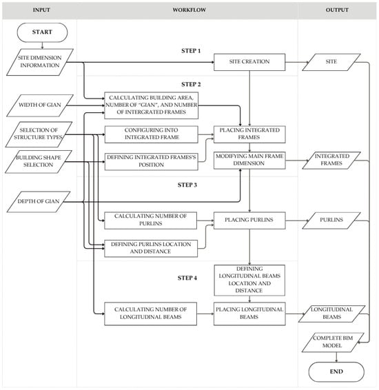 This study develops an automated configuration algorithm process to streamline the configuration of VVA (Figure 15). Developed using Dynamo, a visual programming interface integrated with Autodesk Revit, the algorithm aims to simplify complex design tasks, minimize human error, and boost overall modeling efficiency. The process begins with acquiring user-defined input data, including site-specific parameters and fundamental structural properties. The preliminary processing of site characteristics follows this in order to determine building placement and generate the site outline. The subsequent phase focuses on establishing the main structural framework, where the algorithm precisely positions and adjusts frame components, accounting for specific corner integrations. Finally, the process outlines the meticulous arrangement of roof purlins and the installation of longitudinal beams, all guided by the initial parameters and foundational structural logic. To ensure cultural and structural authenticity, the automation of VVA-based configurations adheres to the criteria summarized in Section 6.1, specifically: (1) adherence to the Sam Ruler system as outlined by Le and Cao [], guaranteeing proportional accuracy for dimensions like “Long Nha,” “Khoang Ngang,” and roof slopes; (2) selection of structural typologies (e.g., Stacked Beams, Gong-Hanger) derived from the 11-volume IFCM dataset; and (3) the use of parametric inputs for site-specific and structural properties, allowing for geometric flexibility and scalability. These criteria, deeply rooted in VVA’s traditional construction logic and contemporary BIM workflows, ensure that the automated configurations effectively preserve cultural heritage while meeting modern design requirements, forming a robust foundation for the algorithm’s development. Translating these basic principles and the detailed five-phase framework into practice, each algorithm phase was subsequently developed and executed within the Dynamo visual programming environment.