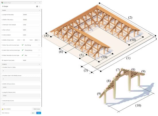 Figure 16 illustrates the validation results of the automated configuration algorithm developed for conceptualizing designs in VVA. A test case was implemented using hypothetical parameters entered via the Dynamo Player interface to assess the algorithm’s performance. These parameters included a U-shaped floor plan, a site length and width of 30,000 mm, a minimum front setback of 3000 mm, rear and side setbacks of 2000 mm, bay widths ranging from 2500 mm to 5000 mm, and a compartment depth of 9000 mm. They selected structural configurations: Gong-Hanger for the Top Roof structure, Stacked Beams for the Side Roof structure, and Console for the Veranda Roof structure.