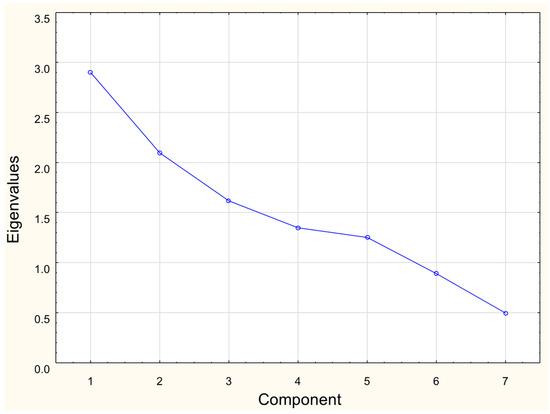 The Principal Component Analysis (PCA) was also conducted to visualize the interrelationships between the Cr, J, Mn, and Br contents, meat type, and kind of heat processing. Based on the scree plot (Figure 1), three Principal Components were included in the PCA model. The PCA was performed using Statistica® 13.1 software.