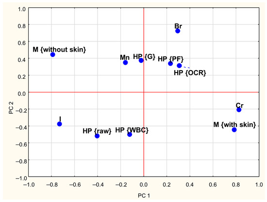 Loadings plots (Figure 2 and Figure 3) graphically illustrate the relationships among individual treatments and meat types. Similar objects are arranged close to each other on a plane. Analysis of both plots reveals clear distinctions between skinless and skin-on meat, as they are located on opposite sides of the coordinate system. A similar pattern was observed concerning heat treatments: the position of WBC-treated meat on the graph suggests that this method exerts a different influence on mineral retention compared to grilling (G), pan-frying (PF), and oven roasting (OCR). Additionally, the proximity of Cr content and meat with skin on the PCA plots suggests that, regardless of the heat treatment method, the presence of skin is associated with higher Cr levels in meat.