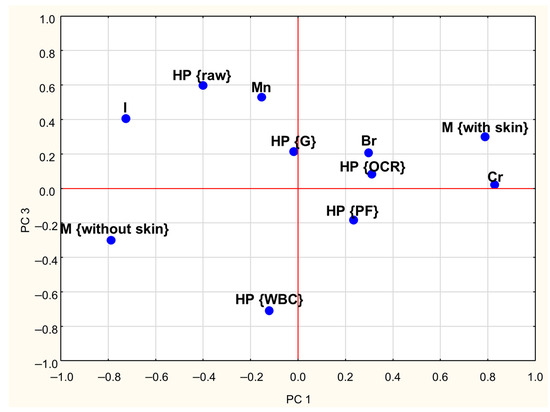 Loadings plot of the first and third PCs (PC1, PC3—first and third Principal Components; HP—heat processing; M—type of meat; WBC—water bath cooking; G—grilling; OCR—Oven Convection Roasting; PF—pan frying; Cr, Br, I, Mn—contents of particular trace elements).
