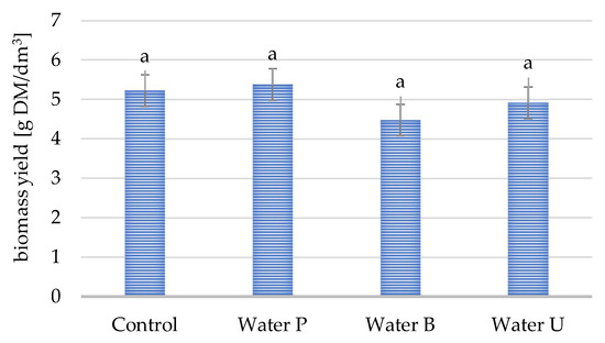 Biomass yield after 96 h yeast culture in medium with waste carbon source, where medium ingredients were dissolved in water: Water C—control redistilled water; Water P, B and U—tap water collected at different water intakes (p < 0.05).