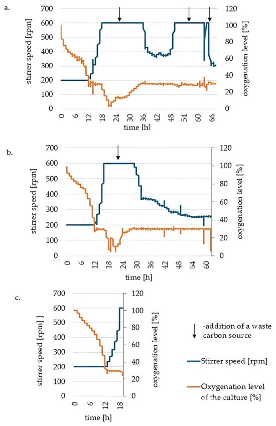 In a 65 h culture with distilled water (Figure 2a), the cells entered a logarithmic growth phase after about 10 h, causing the oxygenation of the medium to drop to 50% of the initial value. As a result of intensive cell proliferation, there was a significant decrease in the oxygenation of the medium. Supplementation of the carbon source at 16, 50 and 62 h promoted lipid storage accumulation. Most of the waste oil depletion in medium occurred during the logarithmic growth phase, and each carbon source supplementation increased the stirrer speed, reflecting the higher oxygen demand as cell growth intensified. According to the knowledge of the biochemical pathways of microbial oil accumulation, a high carbon source-to-nitrogen ratio promotes lipid synthesis in oleaginous microbial cells [30].