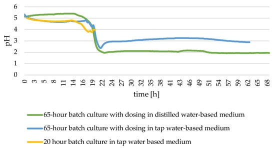 As demonstrated in Figure 3, the pH of the medium during the cultivation of Y. lipolytica yeast remained consistent across all experiments. Initially, the pH level remained stable for approximately 14 to 16 h, followed by a rapid decline, reaching its minimum around 22 h in cultures lasting 65 h. After this point, the pH level remained at a similar level for the remainder of the culture. In the experiment conducted in a distilled water-based medium, the pH level was higher at the beginning of the experiment; however, after 20 h, it had decreased to a level that was lower than that of the variant with tap water. The initial pH of the medium for each of the three cultures was set at 5, and the final pH in the 65 h cultures in the experiment with medium prepared with distilled water was within 2, while in the tap water it was within 3. Following the completion of the 20 h culture, the culture was concluded when the pH level reached approximately 4.