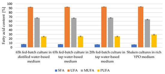 It can be seen (Figure 4) that the intracellular lipids of Y. lipolytica yeast are rich in monounsaturated fatty acids—they comprised close to 70% of the total of all fatty acids. Such a result is similar to the composition of fats found in cells, multiplied in a culture shaken in rich YPO medium as a control variant. The medium used in the batch and fed-batch cultures was characterised by a high carbon to nitrogen source ratio, while no nitrogen source limitation was applied in the YPO medium. The saturated fatty acid content of the microbial oils was low (6.61% to 7.44% on average), which was considered a positive characteristic from a nutritional point of view.