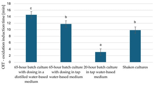 Oxidation induction time of microbial oils of Y. lipolytica yeast multiplied in bioreactor cultures in nitrogen source-limited medium and in rich YPO medium without nitrogen limitation (p < 0.05). a,b,c—non-homogeneous groups.