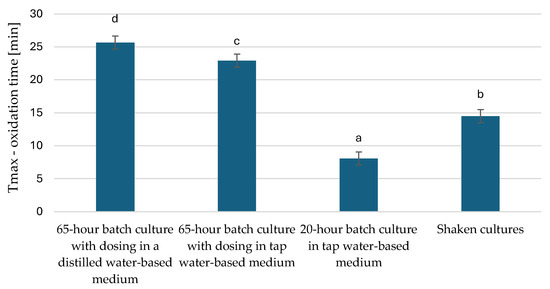In the study by Wierzchowska et al. (2022), where post-frying rapeseed oil was used in culture, the value of the T max parameter was 26.23 min in a 62 h culture [53], which is very similar to our results obtained in a 65 h culture with distilled water. In a study by Bryś et al. (2019) [54], where oil derived from roasted hemp seeds was analysed, the oxidation induction time ranged from 13.6 to 28.9 min. Compared to other oils, hemp oil is highly susceptible to oxidation, which can be linked to the high content of polyunsaturated fatty acids in the oil [54]. The authors of this publication related their results to a study by Ciemniewska-Żytkiewicz et al. (2014) [55], where the oxidative stability of hazelnut oil, olive oil, and rapeseed oil was analysed. The results were characterized by values above 100 min (hazelnut oil and olive oil), showing that these oils are the most stable [55]. In our study, the fat oxidation times obtained are certainly related to the fatty acid composition and the high content of unsaturated fatty acids. The data obtained by these experimental methods can be successfully used to optimise processing and storage conditions to extend the oil’s shelf life [56].