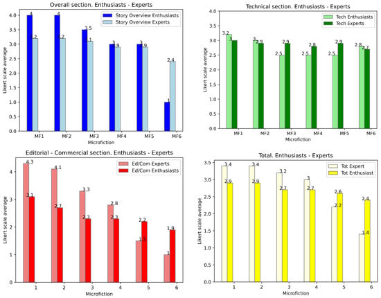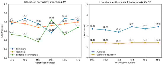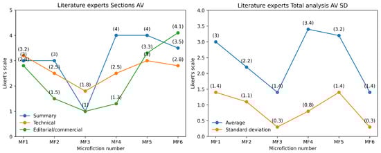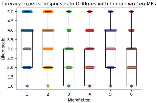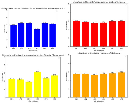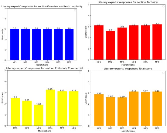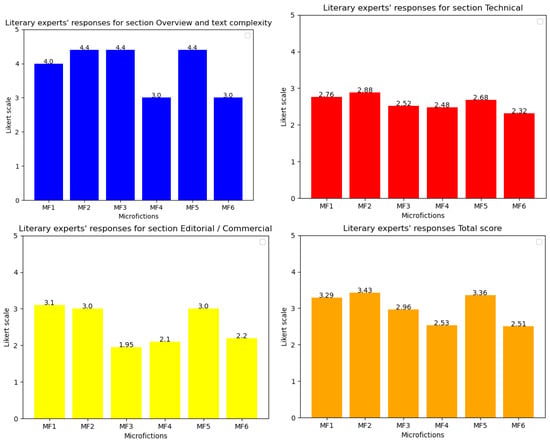 From the responses obtained and displayed in Table 4 and Table 5, and Figure 4 and Figure 5, it can be concluded that the literary experts rated microfictions 1 and 2 (authored by the expert writer) more favorably. However, the responses show a high standard deviation, indicating that while the evaluations were generally positive, there was significant variation among the experts. Additionally, the lowest-ranked microfictions were 4 and 6, which had a lower response average, also exhibited a lower standard deviation, suggesting greater agreement among the judges. These texts were written by the emerging author (MF 4) and medium-experience author (MF 6).