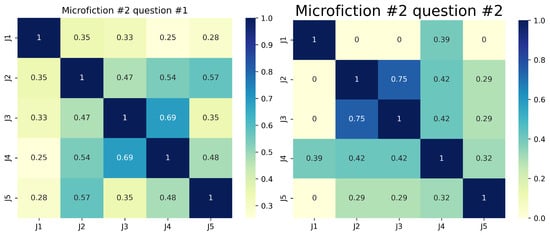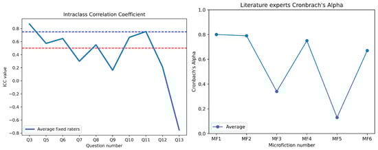 The reliability of the evaluation protocol questions was assessed using the intra-class correlation coefficient (ICC), which measures the degree of consistency or agreement among responses. Higher ICC values indicate strong reliability, while lower or negative values suggest inconsistencies in response patterns. Additionally, the average score (AV) provides insight into the perceived difficulty or clarity of each question. The internal consistency of the responses by microfiction was evaluated using Cronbach’s alpha, with the values categorized into standard reliability thresholds. Given the sensitivity of both the ICC and Cronbach’s alpha to sample size, we additionally used Kendall’s W to evaluate the concordance coefficient. Kendall’s W is more appropriate for smaller sample sizes, ensuring a more robust assessment of inter-rater agreement in our study.