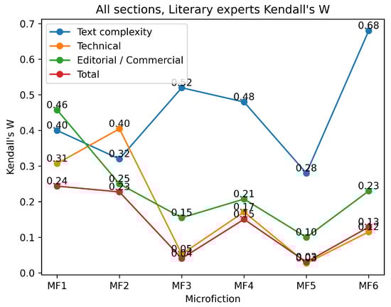 These results suggest a direct correlation between the authors’ expertise and the internal consistency of the texts. The microfictions written by the expert author (MF 1 and MF 2) exhibited the highest Cronbach’s alpha values of 0.80 and 0.79, respectively, indicating good to acceptable internal consistency (see Table 6 and Figure 6). This suggests that the Expert group evaluated the microfiction written by expert writers with higher coherence and internal consistency.