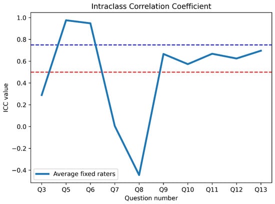 ICC and Cronbach’s alpha line charts of the Experts group’s evaluation of human-written microfiction. Blue Dashed Line (0.75): This line represents the threshold for good reliability. Red Dashed Line (0.5): This line indicates the threshold for moderate reliability.