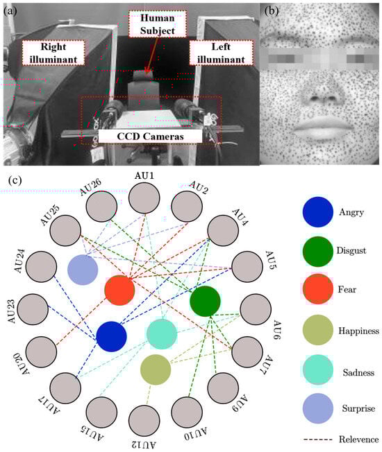 (a) Experimental setup, (b) the cropped images of facial skin with irregular spots, and (c) relevance between facial expressions and Aus [30,31].