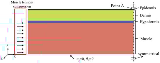 A FE model of soft tissue that includes skin and muscle layers. The bottom of the muscle is fixed in the y-direction displacement and constrained against rotation about the z-axis. Symmetry constraints are applied to the right sides of both the skin and muscle. Muscle contraction is simulated by applying a horizontal displacement load to the left side of the muscle.