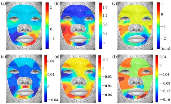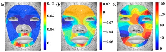 As described in Section 2.1, facial images making six basic expressions were obtained. To analyze facial deformation patterns captured by CCD cameras, we focus on specific regions within the face images. An irregular region is selected from the cropped image for analysis. The eye and nose regions are excluded due to the absence of speckles, which prevent accurate deformation tracking. Additionally, the nose region is disregarded, as its high curvature and minimal deformation could introduce significant errors in the displacement calculations. Figure 3a–c depict the horizontal, vertical, and normal displacement distributions across the entire face during a happy facial expression, represented within the local coordinate system. The results reveal substantial movement at the corners of the mouth and cheeks, which is consistent with cheek bulging and mouth widening during laughter.
