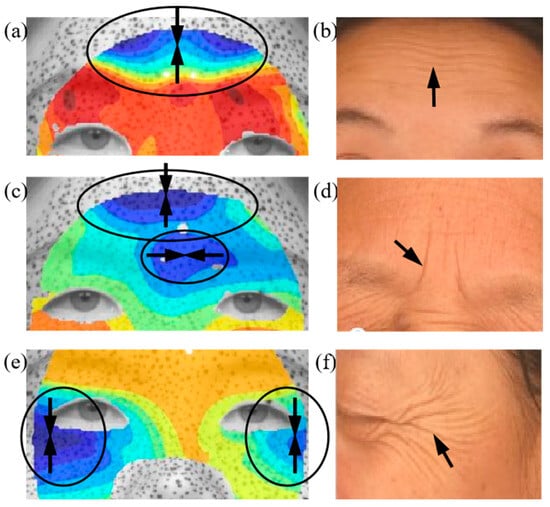 Figure 5a highlights the regions of maximum compression during a surprised expression, with the minimum principal strain directions indicated by black arrows. The wrinkles shown in Figure 5b correspond to forehead lines [34], which predominantly appear horizontally on the foreheads of aged individuals. The results indicate that the formation of forehead lines coincides with the region of maximum compression during surprised expressions, with the principal direction being perpendicular to the forehead lines. Similarly, Figure 5c presents the minimum principal strain distribution during a fear expression, revealing significant compressive deformation in the forehead and glabellar regions. The strain direction in the forehead aligns with forehead lines. Figure 5d shows that the glabellum line relates to the minimum principal strain and its direction. Crow’s feet, one of the most common facial wrinkles, typically develop in this region with a distinctive fishtail pattern. A comparison between the strain distribution in Figure 5e and the crow’s feet formation in Figure 5f further confirms a strong correlation between mechanical strain and wrinkle development.