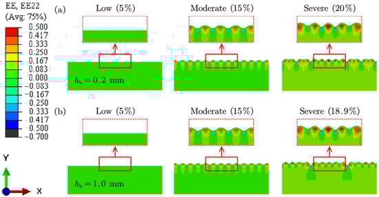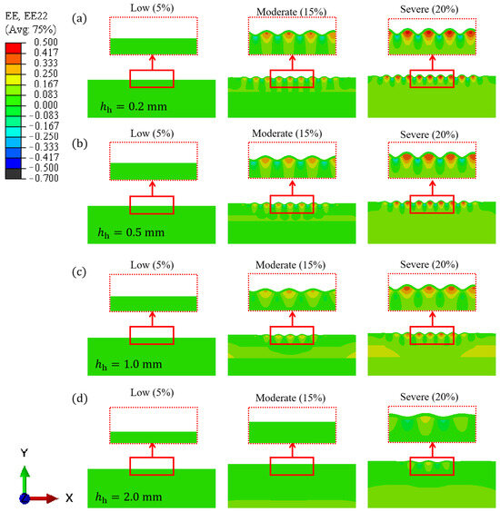 Facial expressions significantly impact skin deformation, influencing both the distribution and orientation of facial wrinkles. The way the skin undergoes compression plays a crucial role in determining where and how wrinkles develop. Understanding the mechanical environment of the skin is key to investigating wrinkle formation. In this study, the FE method is employed to quantitatively examine the relationship between wrinkle formation and muscle-induced compression. Figure 6 presents the strain distributions of skin wrinkling across different skin models with hypodermis thicknesses of 0.2, 0.5, 1.0, and 2.0 mm. At low levels of muscle compression (approximately 5% compressive strain), the skin remains relatively smooth with minimal buckling. As muscle compression increases, wrinkles begin to form on the skin. These wrinkles create peaks and valleys, resulting in tensile and compressive strains, respectively.