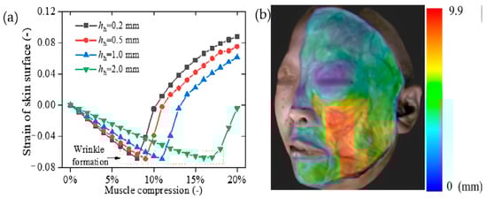 (a) The strain of skin surface under muscle contraction, and (b) distribution of hypodermis thickness in the face [35].