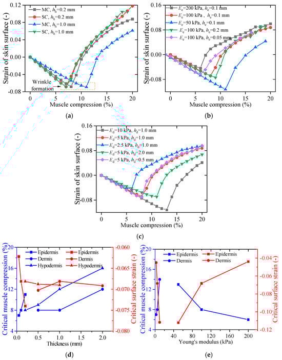 Strain distribution on the skin surface under different conditions: (a) comparison between MC and SC, (b) effects of varying epidermis thickness and Young’s modulus, (c) effects of varying dermis thickness and Young’s modulus, and critical muscle compression and wrinkle strain related to (d) skin layer thickness and (e) Young’s modulus.