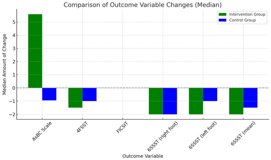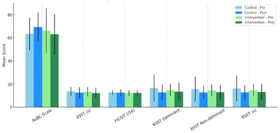 In the intervention group, post-intervention improvements were found in the outcomes of the AsBC, 4SST, 6SST right foot, 6SST left foot, and 6SST mean. On the other hand, in the control group, post-intervention improvements were found in the outcomes of the 4SST, 6SST right foot, 6SST left foot, and 6SST mean. Neither group had an improvement in static stability, as measured by the FICSIT. The detailed results of the pre–post-intervention comparison within each group is shown in Table 2 and Figure 1.