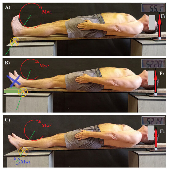 To measure the centre of gravity of the body, the one-sided lever method was used, in which the beam is supported at one point and can rotate around it. The lever is set into rotation by the torques acting on it. If these moments balance each other, the lever is in equilibrium. This property of the lever was used to determine the general centre of gravity of the body and the centre of gravity of the leaning body on the axis of the upper ankle joint. The human body, positioned on a rigid wooden board, and reaction forces were measured at the level of the top of the head (Figure 1A–C). During each measurement, the human arms and hands were placed alongside the body. Body weight was recorded using an electronic scale with a range of 0 to 100 kg.