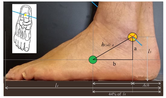 Location of the centre of gravity of the foot and determination of the arm of gravity of the foot (hCoG_4). l3—distance from the ground to the axis of the upper ankle joint, l4—length of the foot, Ach—the distance between the insertion of the Achilles tendon to the calcaneal tuberosity and the projection of the point of the axis of the upper ankle joint at the top of the lateral ankle, a—half the distance from l3, b—44% from l4 reduced by the distance Ach, hCoG_4—the closest distance from the centre of gravity of the foot to the axis of rotation of the upper ankle joint, axis of upper ankle joint—blue line.