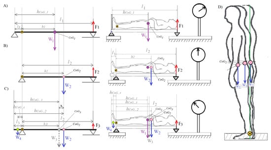 Given the force value F1 = 55.1 kG and the human height l1 = 1.82 m, and knowing the body weight W1 = 94.2 kG, the location of the centre of gravity of the body (hCoG_1) was calculated based on the principle of moments of force (MW1, MF1) in a one-sided lever (2) (Figure 3A).