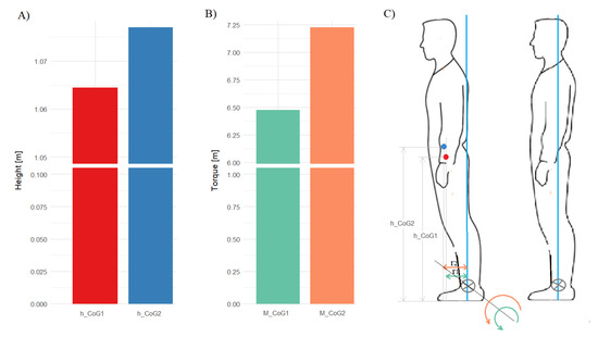 The higher centre of gravity of the tilting part of the body at the upper ankle joint increases the gravitational torques, because CoG2 can “shift” further when tilting forward compared to CoG1, and therefore has a larger gravitational arm (Figure 4A–C). CoG1 can extend the furthest forward to the position when its throw falls on the heads of the metatarsals. After exceeding this position, the body loses balance.