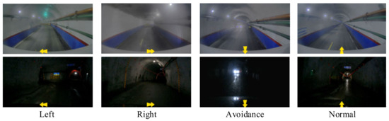 The driving videos included various tunnel types, such as auxiliary transport drifts, inclines, panel area auxiliary transport drifts, return airways, transport airways, auxiliary measure drifts, return air measure drifts, and transport accessory drifts. For maneuvers such as left turns, right turns, and avoidance, the start times were identified in the footage, and 4 s video segments were extracted, starting 4 s before each maneuver’s initiation. A marker was set 0.5 s before the video to signal the forthcoming action. Similarly, 4 s segments for normal driving were extracted, also marked with a 0.5 s indicator. The video marking format is illustrated in Figure 2. In total, 156 video segments were extracted: 39 for upcoming left turns, 38 for upcoming right turns, 39 for normal driving, and 40 for upcoming avoidance.