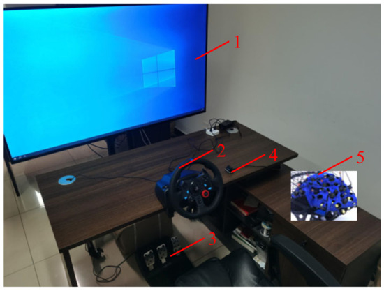 Experiment platform setup: 1—display screen; 2—steering wheel; 3—pedals; 4—button; 5—EEG cap.